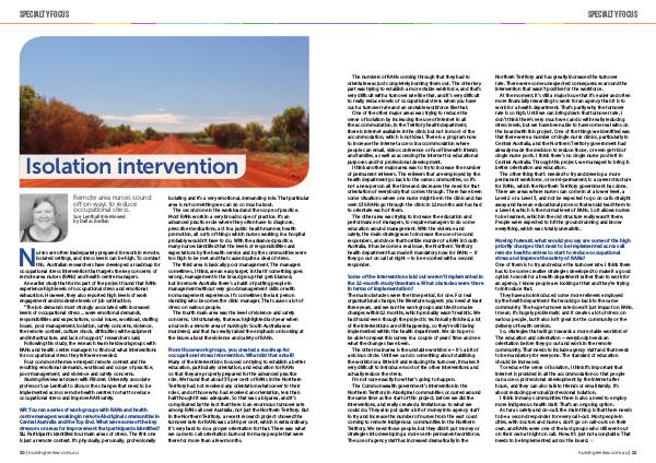 From those work groups, you created a roadmap for occupational stress intervention. What did that entail? Many of the interventions focused on trying to establish a better education, particularly orientation, and education for RANs so that they are properly prepared for the advanced practice role. We found that about 35 per cent of RANs in the Northern Territory had not received any orientation whatsoever to their roles, and of those who had received an orientation, less than half thought it was adequate. So that was a big area, and it’ s complicated by the fact that there is an enormous turnover rate among RANs all over Australia, not just the Northern Territory. But in the Northern Territory, a recent research project showed the turnover rate for RANs was a 146 per cent, which is extraordinary. It’ s very hard to do a proper orientation for that. There was what we came to call orientation burnout for many people that were there for more than a few months.