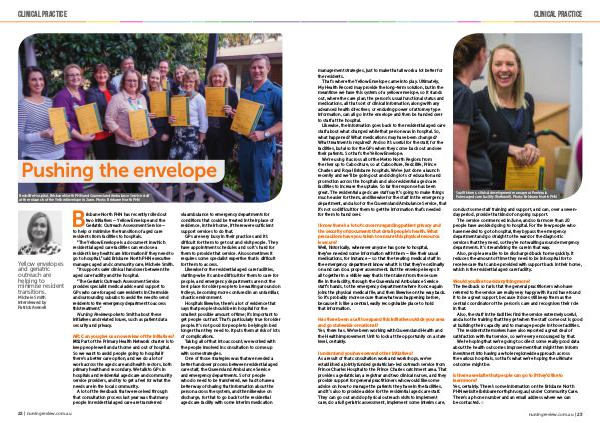 NR: Can you give us an overview of the initiatives? MS: Part of the Primary Health Network charter is to keep people well and at home and out of hospital. So we want to avoid people going to hospital if there’ s a better care option, and we do a lot of work across the aged care and health sectors, both primary health and secondary. We talk to GPs in hospitals and residential aged care and community service providers, and try to get a feel for what the needs are in the local community.
