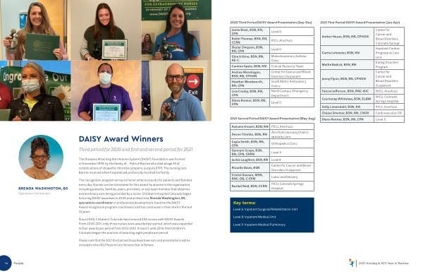 This recognition program serves to honor what nurses do for patients and families every day . Nurses can be nominated for this award by anyone in the organization , including patients , families , peers , providers , or any team member that observes extraordinary care being provided by a nurse . Children ’ s Hospital Colorado began honoring DAISY awardees in 2006 and at that time , Brenda Washington , BS , operations coordinator in professional development , became the DAISY Award recognition program coordinator and has continued in that role for the last 16 years .