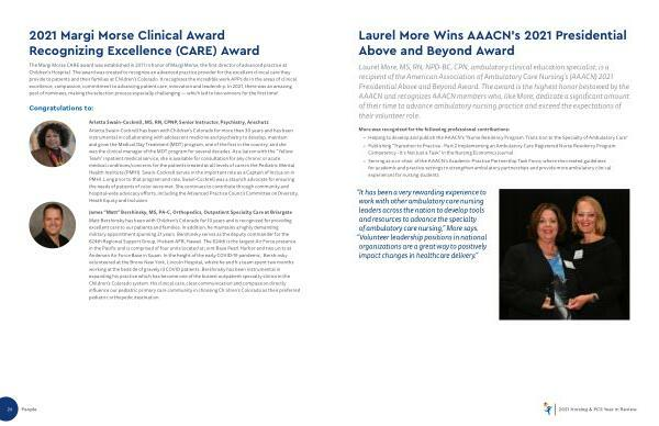 Laurel More , MS , RN , NPD-BC , CPN , ambulatory clinical education specialist , is a recipient of the American Association of Ambulatory Care Nursing ’ s ( AAACN ) 2021 Presidential Above and Beyond Award . The award is the highest honor bestowed by the AAACN and recognizes AAACN members who , like More , dedicate a significant amount of their time to advance ambulatory nursing practice and exceed the expectations of their volunteer role .