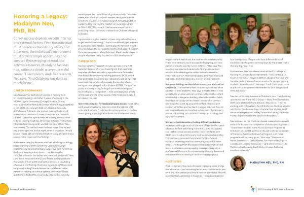 would propel her toward formal graduate study . “ Maureen Keefe , Ann Marie Kotzer , Dori Biester , really everyone at Children ’ s was nurse-forward , research-forward , and they supported my starting the master ’ s in nursing program at CU in 1989 ,” Neu recalls . She became one of the first practicing nurses to conduct research at Children ’ s Hospital Colorado .