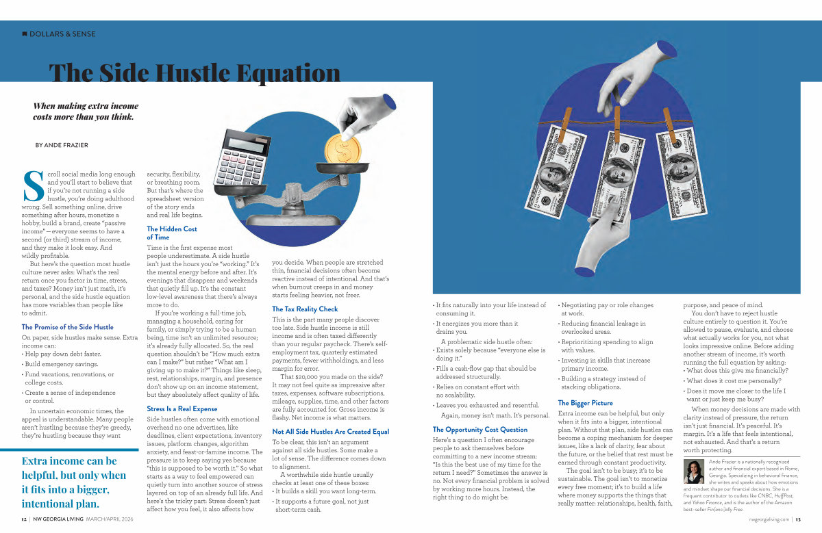 Ande Frazier is a nationally recognized author and financial expert based in Rome, Georgia. Specializing in behavioral finance, she writes and speaks about how emotions and mindset shape our financial decisions. She is a frequent contributor to outlets like CNBC, HuffPost, and Yahoo Finance, and is the author of the Amazon best-seller Fin( anci) ally Free. nwgeorgialiving. com | 13