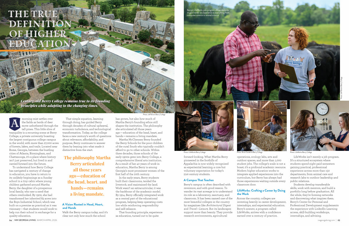 A morning mist settles over the fields as herds of deer move unbothered through the tall pines. This little slice of tranquility is a recurring scene at Berry College, a private university boasting the largest contiguous college campus in the world, with more than 27,000 acres of forests, lakes, and trails. Located near Rome, Georgia, between the bustling cities of Atlanta, Birmingham, and Chattanooga, it’ s a place where history isn’ t just preserved, but lived in and carried forward into the future.