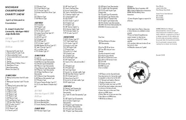 1 HOUR BREAK 28. Driving Class 29. PP English 2 gait 30. TP AOT 2gait O / T 31. PLS 5 & under 2 gait O / T 32. Amateur Novice Rider 2gait O / T 33. LS English 2 gait 34. ADP AOT 2 gait O / T 35. PLS English 2 gait 36. CP AOT 2 gait O / T 37. PP 5 & Under 2 gait O / T 38. NWHA Member 50 & 0ver 2 gait O / T 39. Youth 17 & under 2 gait O / T 40. 2 yr old Open 2 gait 41. TP 5 & Under 2 gait O / T