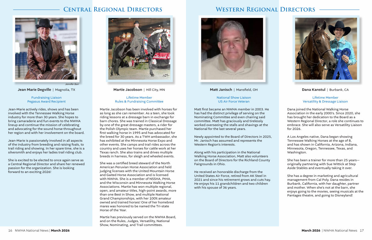 Jean-Marie actively rides, shows and has been involved with the Tennessee Walking Horse industry for more than 30 years. She hopes to bring camaraderie and fun events to the NWHA lineup and continue the mission of celebrating and advocating for the sound horse throughout her region and with her involvement on the board.