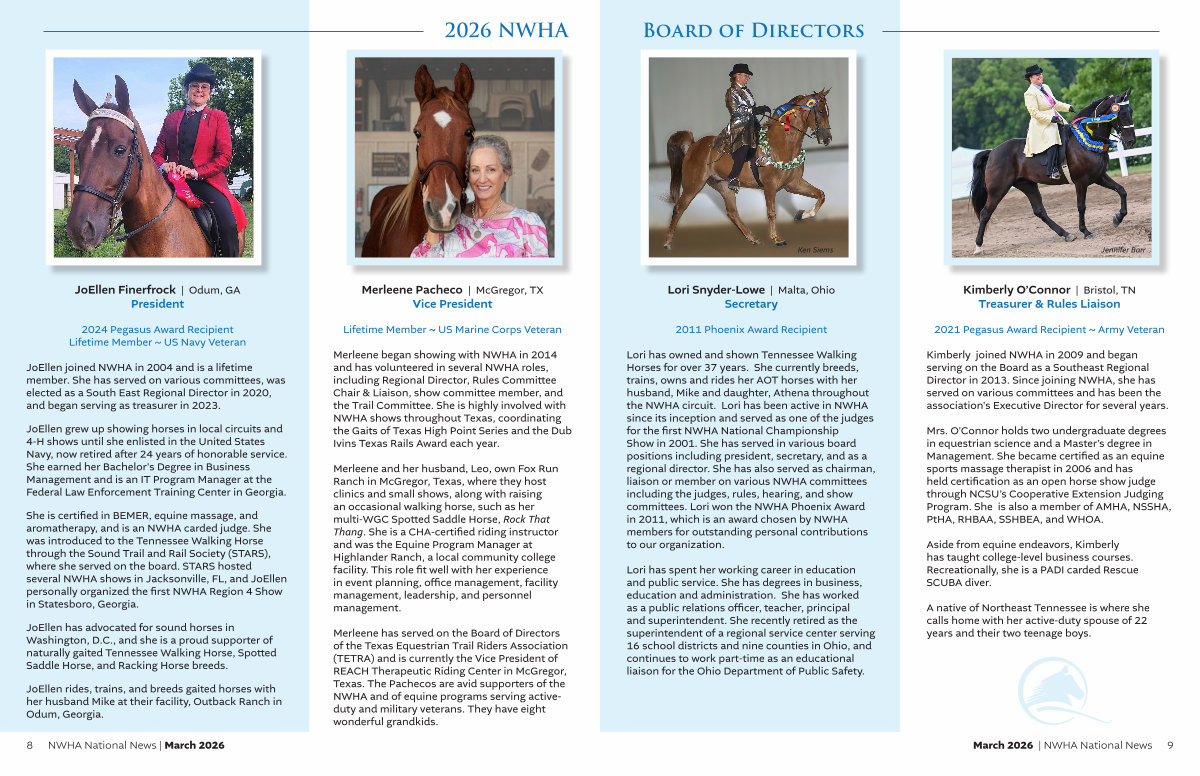 Merleene and her husband, Leo, own Fox Run Ranch in McGregor, Texas, where they host clinics and small shows, along with raising an occasional walking horse, such as her multi-WGC Spotted Saddle Horse, Rock That Thang. She is a CHA-certified riding instructor and was the Equine Program Manager at Highlander Ranch, a local community college facility. This role fit well with her experience in event planning, office management, facility management, leadership, and personnel management.