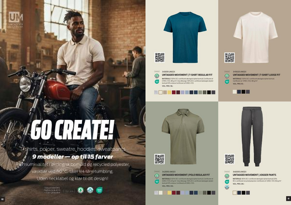 T-shirts, poloer, sweatre, hoodies, sweatpants 9 modeller— op til 15 farver Premiumkvalitet i økologisk bomuld og recycled polyester, vaskbar ved 60˚C, tåler let tørretumbling. Uden necklabel og klar til dit design!