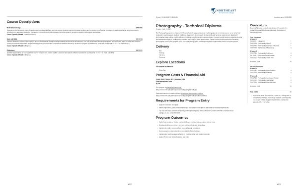 The Photography program is designed for those who wish to pursue a career in photography as an entrepreneur or as an entry-level employee in a photography studio or marketing department . Students will develop skills and hands-on experience in digital still photography , image editing , studio and natural lighting , and photography business needs . Courses provide hands-on experience using the latest technologies , in studio and on location work , and live client opportunities . Career choices include portrait and wedding photographer , nature photographer , sport and event photographer , product photographer , digital artist and fine art photographer .
