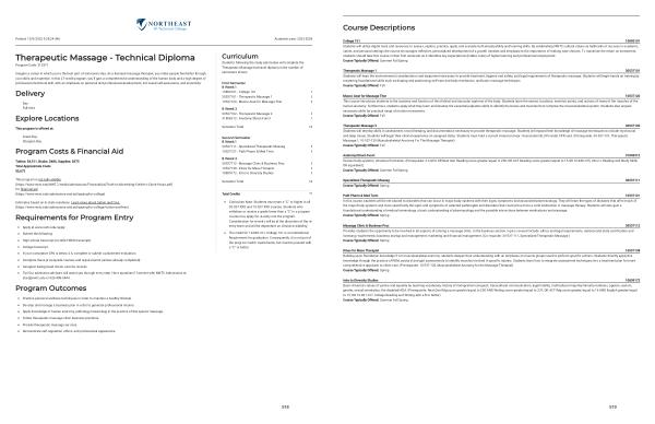 Therapeutic Massage 1 30537101 Students will learn the environmental considerations and equipment necessary to provide treatment , hygiene and safety , and legal requirements of therapeutic massage . Students will begin hands on training by mastering foundational skills such as draping and positioning , self-care and body mechanics , and basic massage techniques . Course Typically Offered : Fall