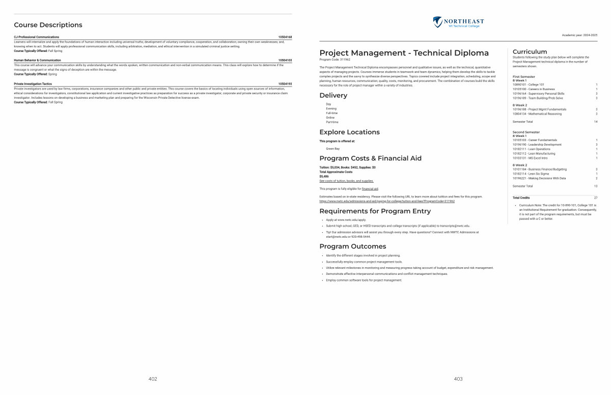 The Project Management Technical Diploma encompasses personnel and qualitative issues, as well as the technical, quantitative aspects of managing projects. Courses immerse students in teamwork and team dynamics, helping them develop the skills to tackle complex projects and the savvy to synthesize diverse perspectives. Topics covered include project integration, scheduling, scope and planning, human resources, communication, quality, costs, monitoring, and procurement. The combination of courses build the skills necessary for the role of project manager within a variety of industries.