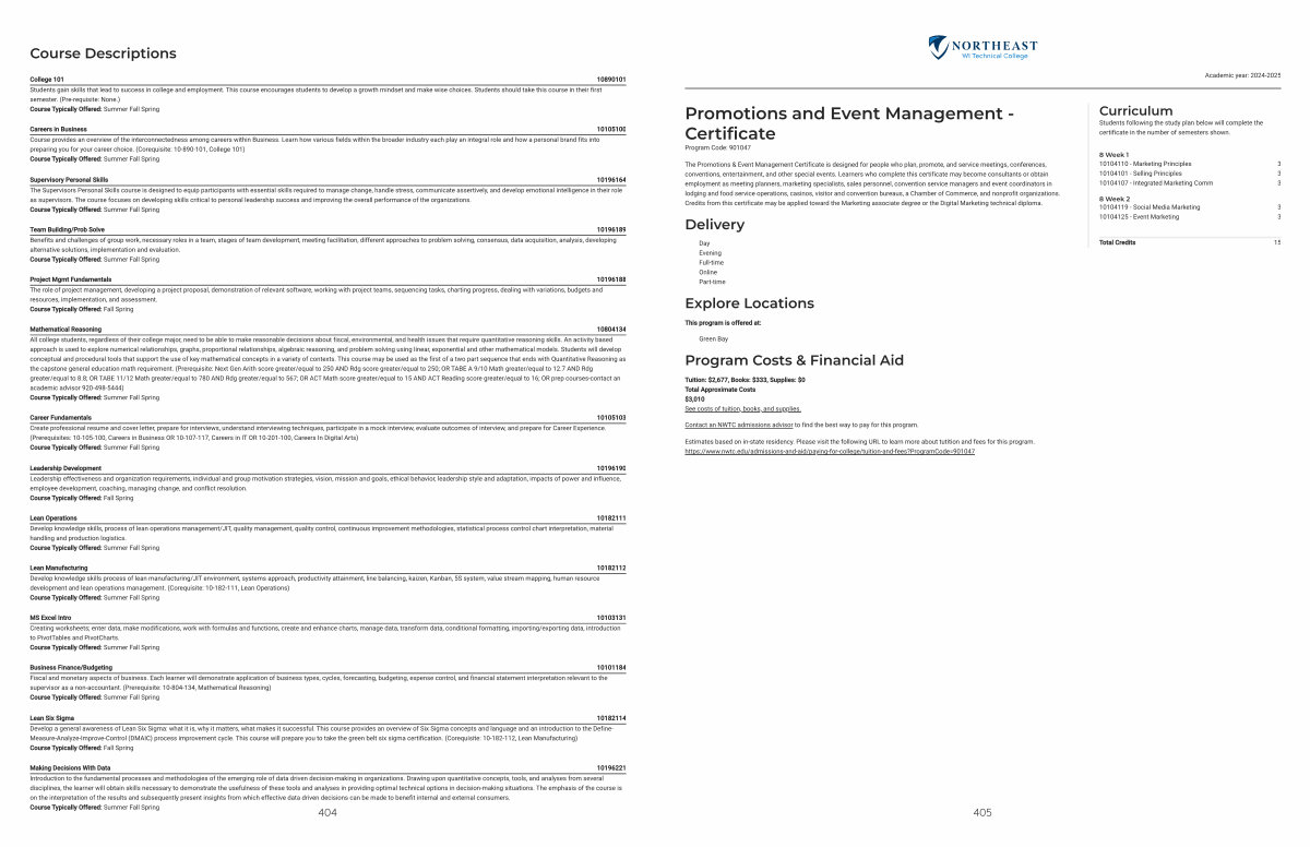 The Promotions & Event Management Certificate is designed for people who plan, promote, and service meetings, conferences, conventions, entertainment, and other special events. Learners who complete this certificate may become consultants or obtain employment as meeting planners, marketing specialists, sales personnel, convention service managers and event coordinators in lodging and food service operations, casinos, visitor and convention bureaus, a Chamber of Commerce, and nonprofit organizations. Credits from this certificate may be applied toward the Marketing associate degree or the Digital Marketing technical diploma.