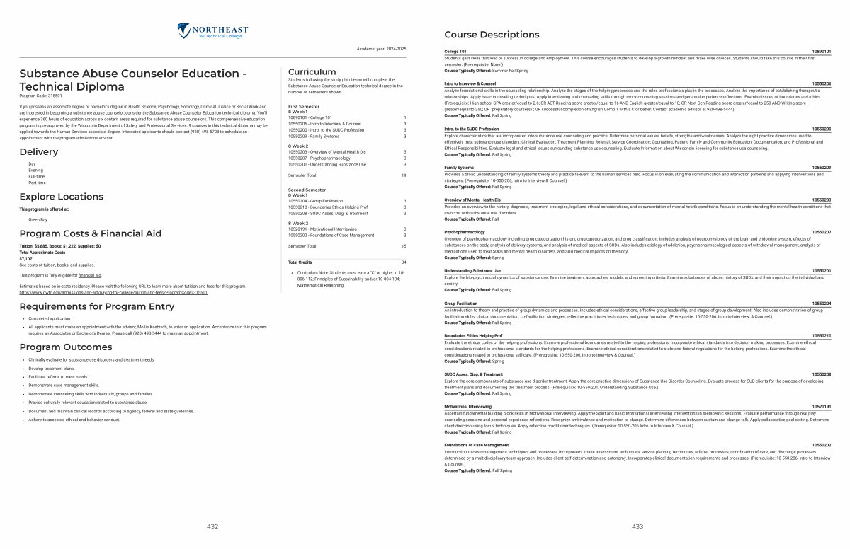If you possess an associate degree or bachelor’ s degree in Health Science, Psychology, Sociology, Criminal Justice or Social Work and are interested in becoming a substance abuse counselor, consider the Substance Abuse Counselor Education technical diploma. You ' ll experience 360 hours of education across six content areas required for substance abuse counselors. This comprehensive education program is pre-approved by the Wisconsin Department of Safety and Professional Services. 9 courses in this technical diploma may be applied towards the Human Services associate degree. Interested applicants should contact( 920) 498-5708 to schedule an appointment with the program admissions advisor.