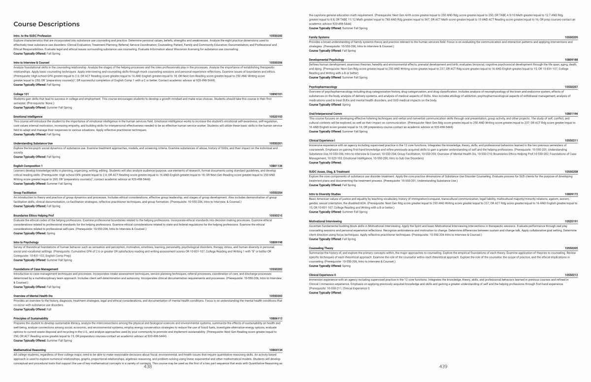 Intro. to the SUDC Profession 10550200 Explore characteristics that are incorporated into substance use counseling and practice. Determine personal values, beliefs, strengths and weaknesses. Analyze the eight practice dimensions used to effectively treat substance use disorders: Clinical Evaluation; Treatment Planning; Referral; Service Coordination; Counseling; Patient, Family and Community Education; Documentation; and Professional and Ethical Responsibilities. Evaluate legal and ethical issues surrounding substance use counseling. Evaluate Information about Wisconsin licensing for substance use counseling. Course Typically Offered: Fall Spring