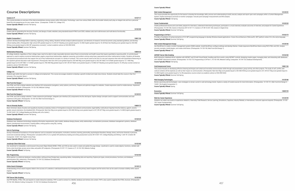 Website Coding 10152185 Create code for generating the structure, function, and design of static websites using standards-based HTML5 and CSS3; validate code; test multi-browser and multi-device functionality. Course Typically Offered: Summer Fall Spring
