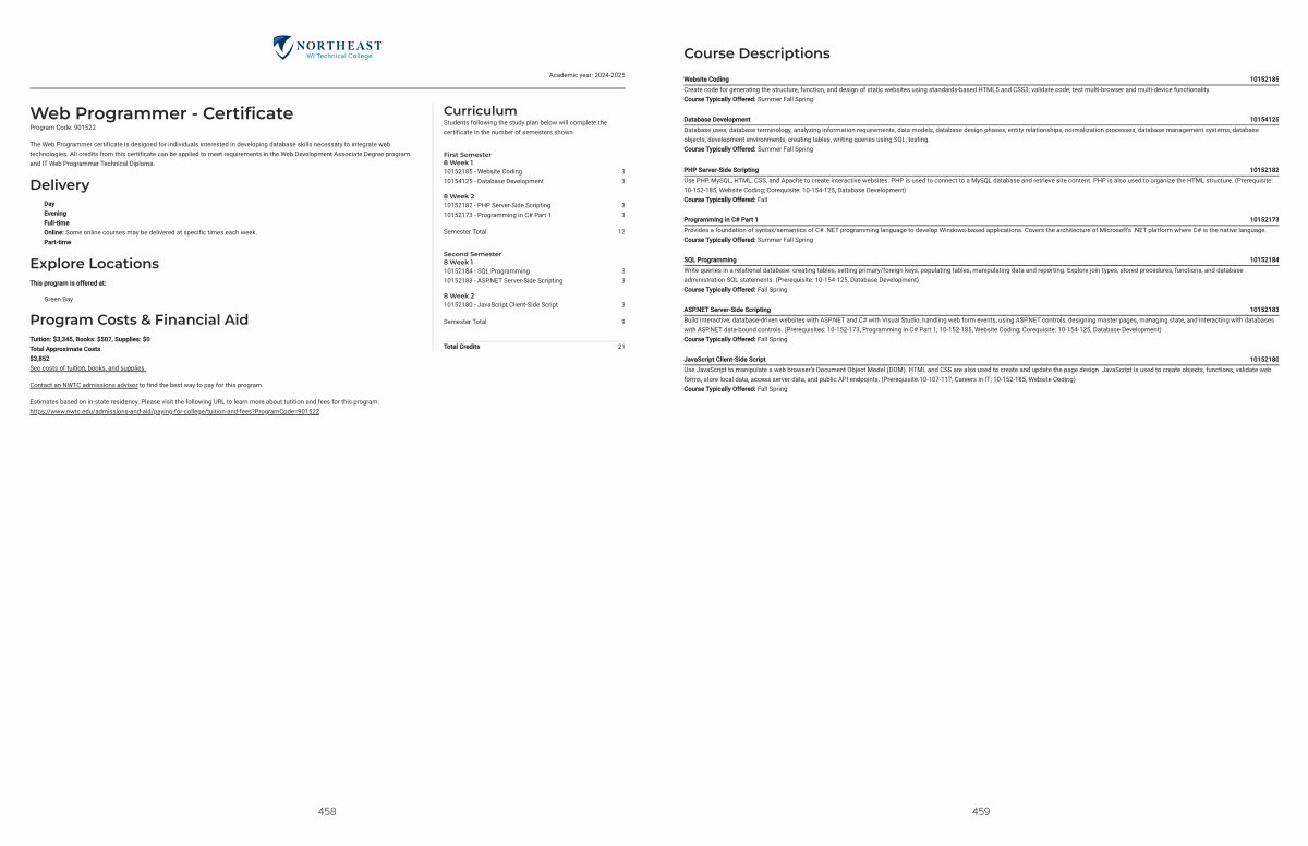 ASP. NET Server-Side Scripting 10152183 Build interactive, database-driven websites with ASP. NET and C # with Visual Studio, handling web form events, using ASP. NET controls, designing master pages, managing state, and interacting with databases with ASP. NET data-bound controls.( Prerequisites: 10-152-173, Programming in C # Part 1; 10-152-185, Website Coding; Corequisite: 10-154-125, Database Development) Course Typically Offered: Fall Spring