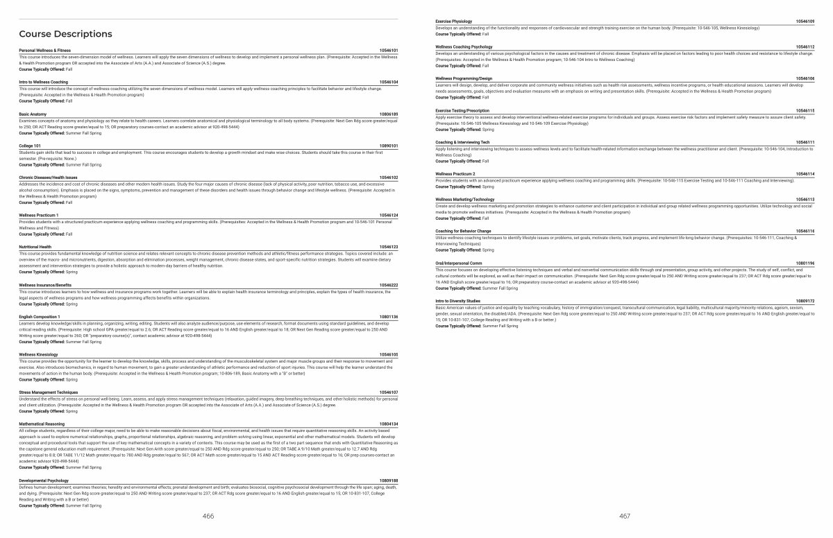 Coaching & Interviewing Tech 10546111 Apply listening and interviewing techniques to assess wellness levels and to facilitate health-related information exchange between the wellness practitioner and client.( Prerequisite: 10-546-104, Introduction to Wellness Coaching) Course Typically Offered: Fall