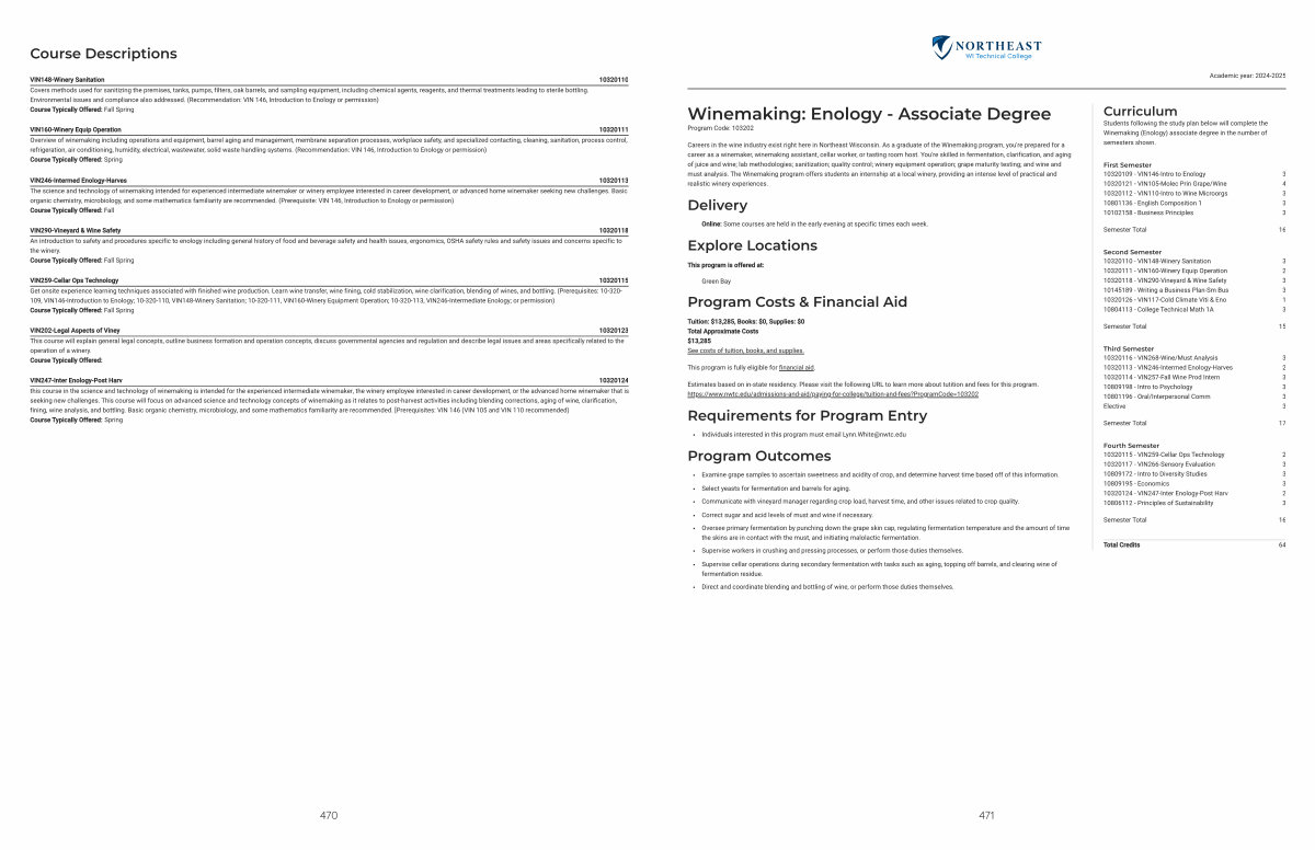 VIN160-Winery Equip Operation 10320111 Overview of winemaking including operations and equipment, barrel aging and management, membrane separation processes, workplace safety, and specialized contacting, cleaning, sanitation, process control, refrigeration, air conditioning, humidity, electrical, wastewater, solid waste handling systems.( Recommendation: VIN 146, Introduction to Enology or permission) Course Typically Offered: Spring