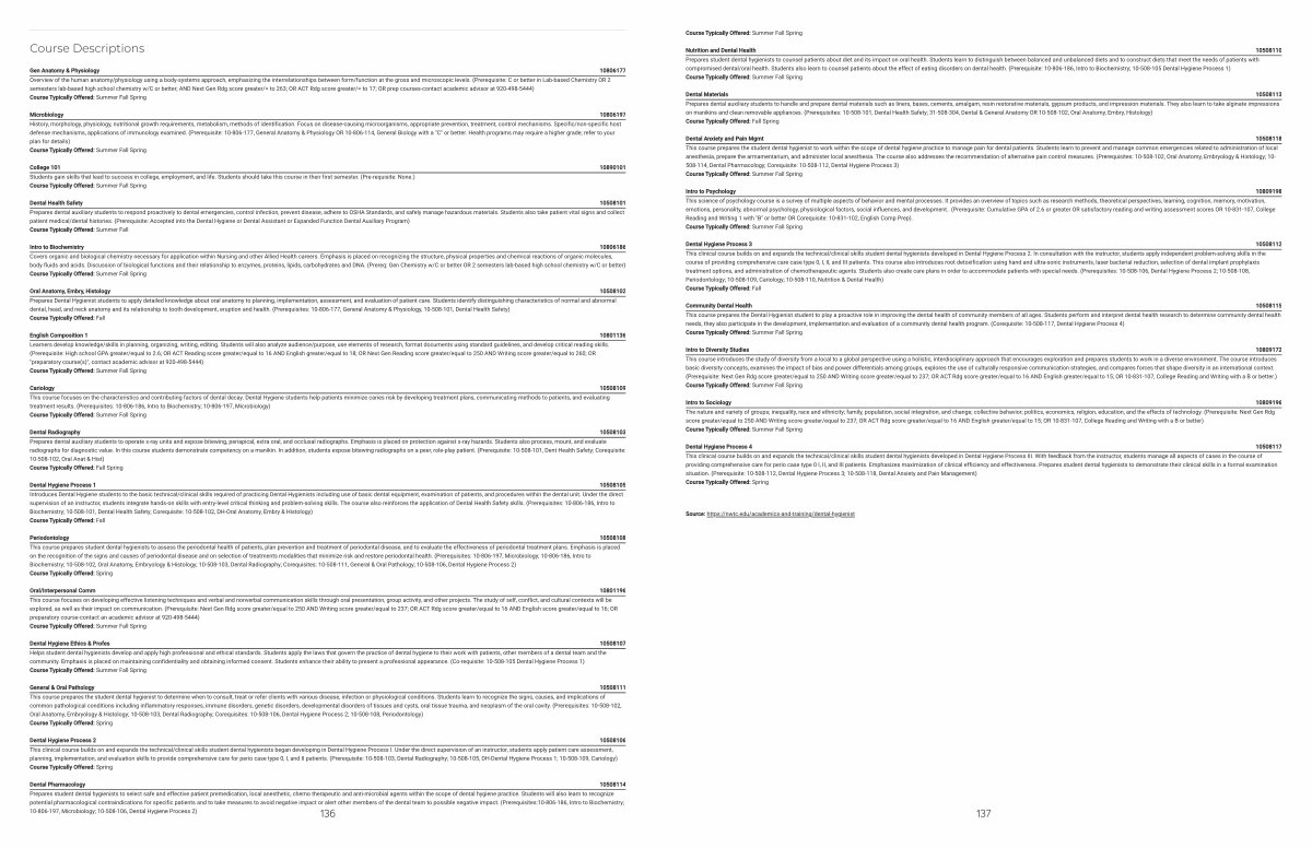 Nutrition and Dental Health 10508110 Prepares student dental hygienists to counsel patients about diet and its impact on oral health. Students learn to distinguish between balanced and unbalanced diets and to construct diets that meet the needs of patients with compromised dental / oral health. Students also learn to counsel patients about the effect of eating disorders on dental health.( Prerequisite: 10-806-186, Intro to Biochemistry; 10-508-105 Dental Hygiene Process 1) Course Typically Offered: Summer Fall Spring