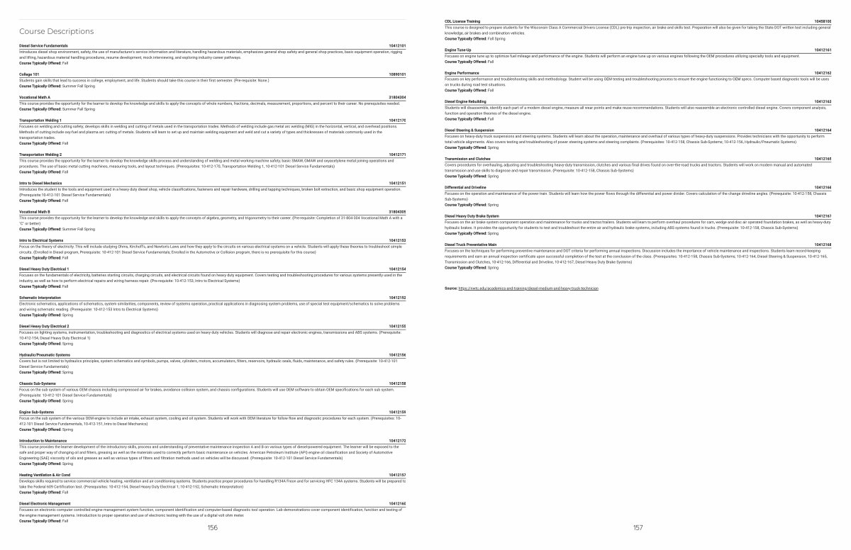 Introduction to Maintenance 10412172 This course provides the learner development of the introductory skills, process and understanding of preventative maintenance inspection A and B on various types of diesel-powered equipment. The learner will be exposed to the safe and proper way of changing oil and filters, greasing as well as the materials used to correctly perform basic maintenance on vehicles. American Petroleum Institute( API) engine oil classification and Society of Automotive Engineering( SAE) viscosity of oils and greases as well as various types of filters and filtration methods used on vehicles will be discussed.( Prerequisite: 10-412-101 Diesel Service Fundamentals) Course Typically Offered: Spring