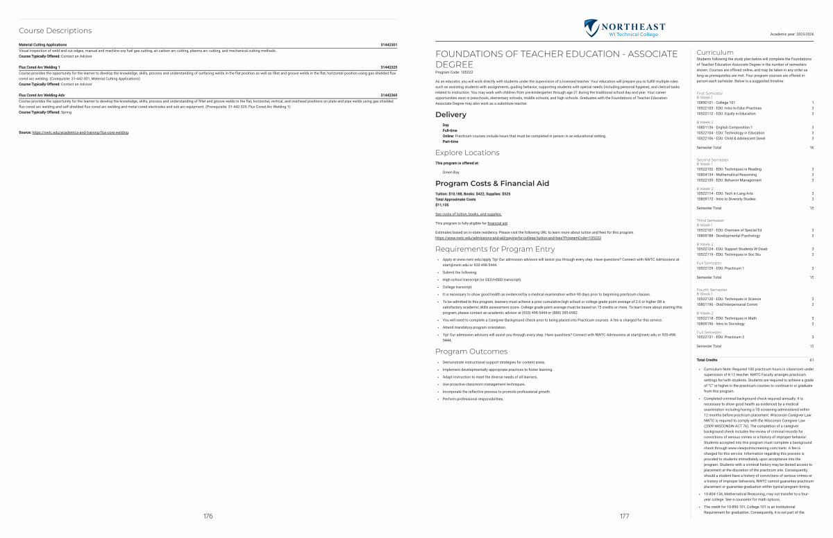 Curriculum Note: Required 100 practicum hours in classroom under supervision of K-12 teacher. NWTC Faculty arranges practicum settings for / with students. Students are required to achieve a grade of“ C” or higher in the practicum courses to continue in or graduate from this program.
