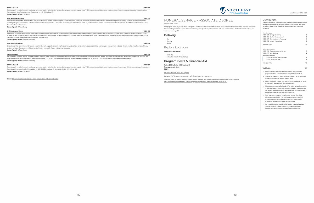 The Funeral Services associate degree is a 2-year collaborative program between Milwaukee Area Technical College and Northeast Wisconsin Technical College. Upon graduation, a student will have completed 64 credits.