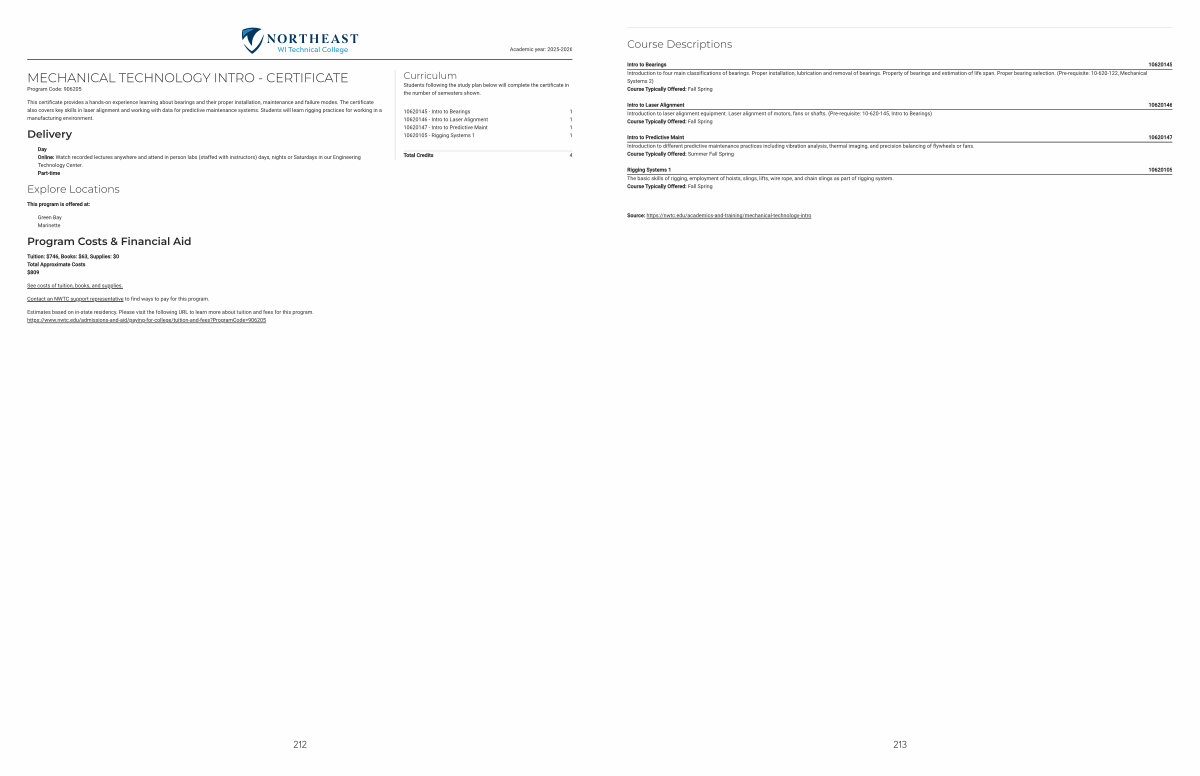 This certificate provides a hands-on experience learning about bearings and their proper installation, maintenance and failure modes. The certificate also covers key skills in laser alignment and working with data for predictive maintenance systems. Students will learn rigging practices for working in a manufacturing environment.
