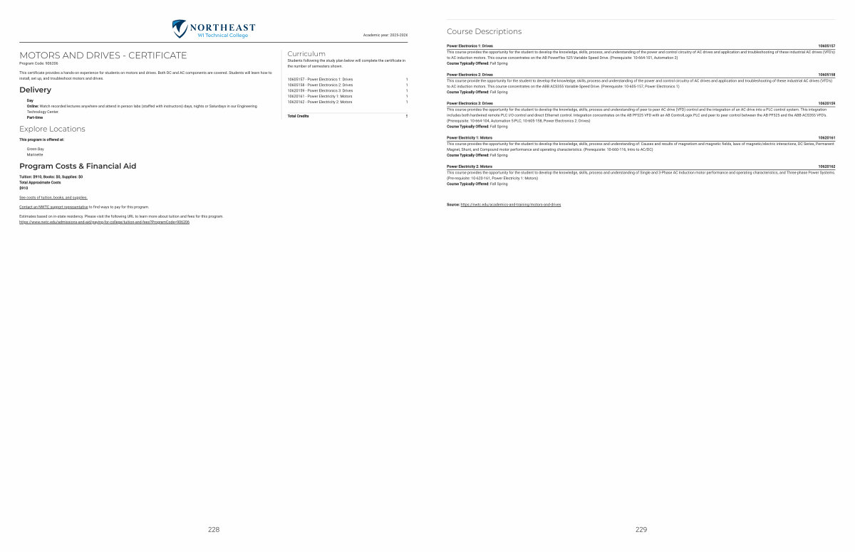 This certificate provides a hands-on experience for students on motors and drives. Both DC and AC components are covered. Students will learn how to install, set up, and troubleshoot motors and drives.