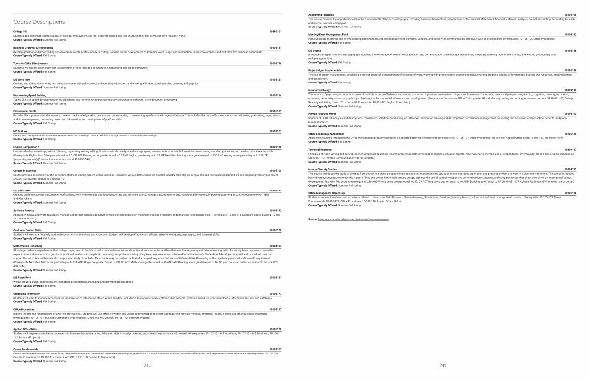 Office Procedures 10106127 Explore the role and responsibility of an office professional. Students will use effective written and verbal communication to create agendas, take meeting minutes, itineraries, letters, e-mails, and other business documents.( Prerequisites: 10-106-131, Business Grammar & Proofreading; 10-103-161 MS Outlook, 10-106-142, Software Projects) Course Typically Offered: Fall Spring