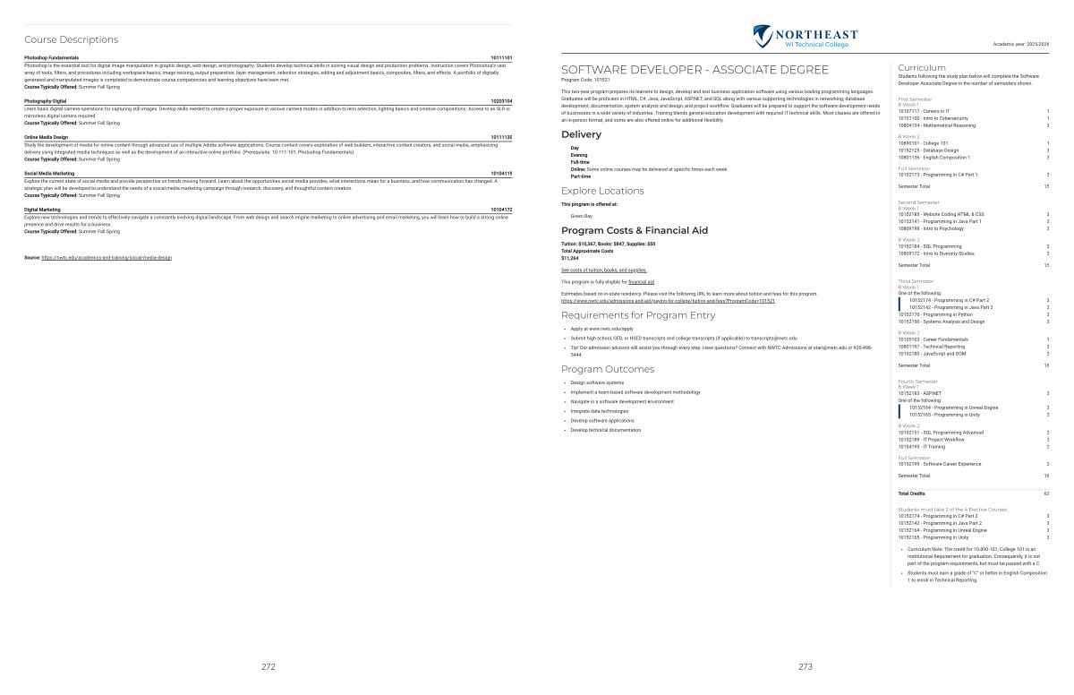This two-year program prepares its learners to design, develop and test business application software using various leading programming languages. Graduates will be proficient in HTML, C #, Java, JavaScript, ASP. NET, and SQL along with various supporting technologies in networking, database development, documentation, system analysis and design, and project workflow. Graduates will be prepared to support the software development needs of businesses in a wide variety of industries. Training blends general education development with required IT technical skills. Most classes are offered in an in-person format, and some are also offered online for additional flexibility.