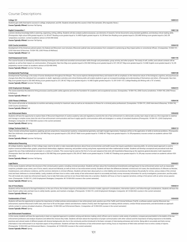 Law Enforcement Basics 10504200 Students will have the opportunity to explore State of Wisconsin Department of Justice academy rules and regulations; examine the role of law enforcement in a democratic society; learn steps to take as a first responder to stabilize and manage a complex scene; learn the role of law enforcement communication and how to apply specific communication skills and strategies in a variety of simulated situations.( Prerequisite: 10-504-191, LEAD Employment Strategies; Corequisite: All 10-504-XXX courses in the current semester) Course Typically Offered: Spring
