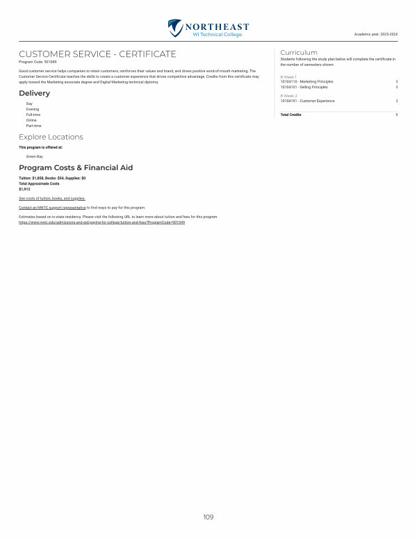 Good customer service helps companies to retain customers, reinforces their values and brand, and drives positive word-of-mouth marketing. The Customer Service Certificate teaches the skills to create a customer experience that drives competitive advantage. Credits from this certificate may apply toward the Marketing associate degree and Digital Marketing technical diploma.