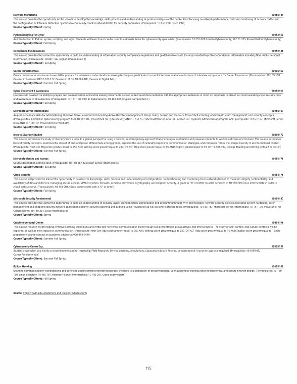 Cyber Document & Awareness 10151103 Learners will develop the ability to prepare and present written and verbal training documents as well as technical documentation with the appropriate audiences in mind. An emphasis is placed on communicating cybersecurity risks and awareness to all audiences.( Prerequisite: 10-151-100, Intro to Cybersecurity: 10-801-136, English Composition 1) Course Typically Offered: Fall Spring
