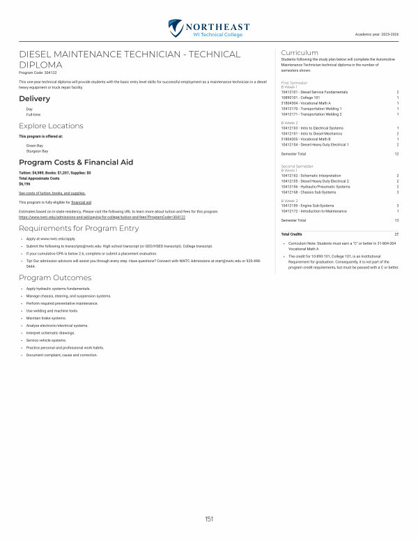 This one-year technical diploma will provide students with the basic entry level skills for successful employment as a maintenance technician in a diesel heavy equipment or truck repair facility.