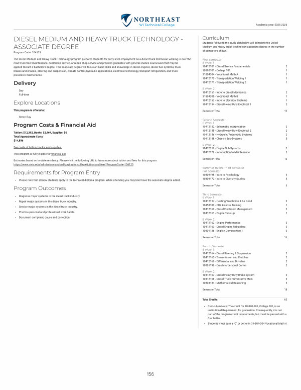 The Diesel Medium and Heavy Truck Technology program prepares students for entry-level employment as a diesel truck technician working in over-theroad truck fleet maintenance, dealership service, or repair shop service and provides graduates with general studies coursework that may be applied toward a bachelor ' s degree. This associate degree will focus on basic skills and knowledge in diesel engines, diesel fuel systems, truck brakes and chassis, steering and suspension, climate control, hydraulic applications, electronic technology, transport refrigeration, and truck preventive maintenance.