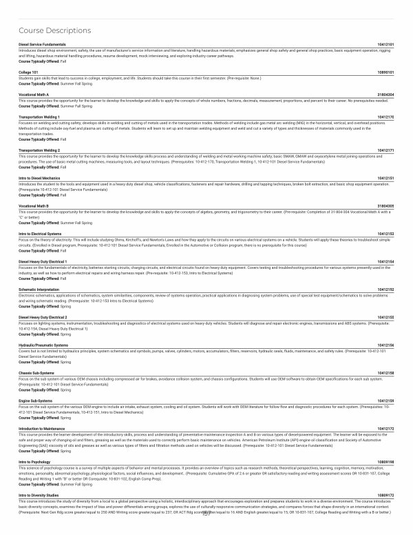 Diesel Service Fundamentals 10412101 Introduces diesel shop environment, safety, the use of manufacturer ' s service information and literature, handling hazardous materials, emphasizes general shop safety and general shop practices, basic equipment operation, rigging and lifting, hazardous material handling procedures, resume development, mock interviewing, and exploring industry career pathways. Course Typically Offered: Fall