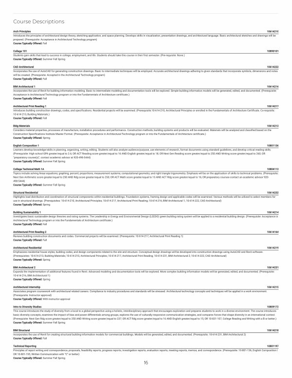 Architectural Residential 10614219 Emphasizes residential house styles, building codes, and design components related to the site and structure. Conceptual design drawings will be developed into construction drawings using AutoCAD and Revit software.( Prerequisites: 10-614-213, Building Materials; 10-614-210, Architectural Principles; 10-614-217, Architectural Print Reading; 10-614-231, BIM Architectural 2; 10-614-222, CAD Architectural) Course Typically Offered: Spring