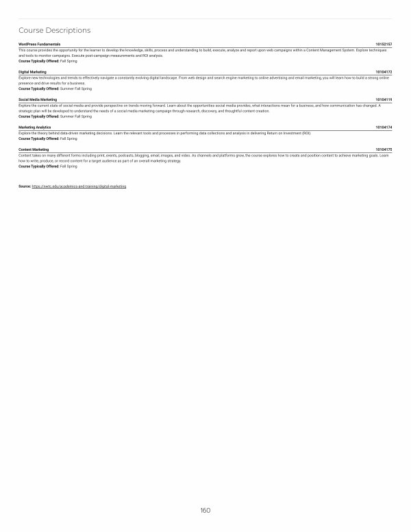Digital Marketing 10104172 Explore new technologies and trends to effectively navigate a constantly evolving digital landscape. From web design and search engine marketing to online advertising and email marketing, you will learn how to build a strong online presence and drive results for a business. Course Typically Offered: Summer Fall Spring
