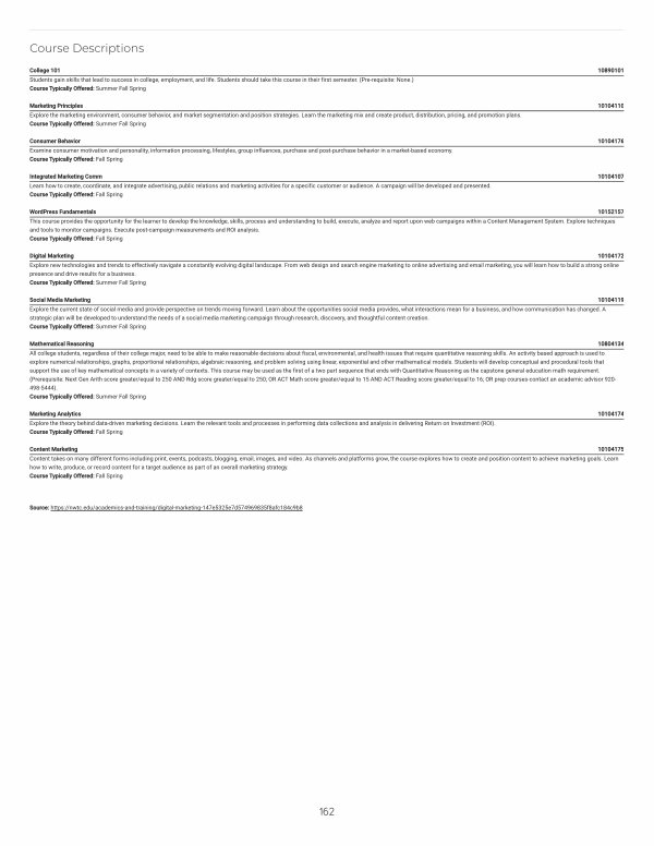 Digital Marketing 10104172 Explore new technologies and trends to effectively navigate a constantly evolving digital landscape. From web design and search engine marketing to online advertising and email marketing, you will learn how to build a strong online presence and drive results for a business. Course Typically Offered: Summer Fall Spring