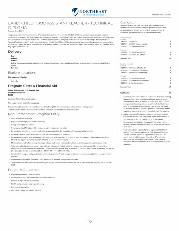 Curriculum Note: Field experience courses include student teaching placement hours which must be completed in person at a local early childhood setting, in addition to course work. NWTC faculty arrange student teaching settings for / with students. Students are required to complete student teaching in each center placement. Students are required to achieve a grade of " C " or higher in the field experience courses to continue in or graduate from this program.