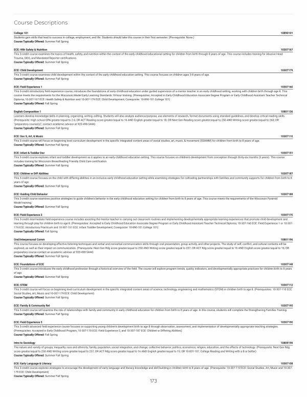 ECE: Field Experience 1 10307160 This 3-credit introductory field experience course, introduces the foundations of early childhood education under guided supervision of a mentor teacher in an early childhood setting, working with children birth through age 8. This course meets the requirements for the Wisconsin Model Early Learning Standards 18-hour training.( Prerequisites: Accepted in Early Childhood Education Associate Degree Program or Early Childhood Assistant Teacher Technical Diploma; 10-307-167 ECE: Health Safety & Nutrition and 10-307-179 ECE: Child Development; Corequisite: 10-890-101 College 101) Course Typically Offered: Fall Spring