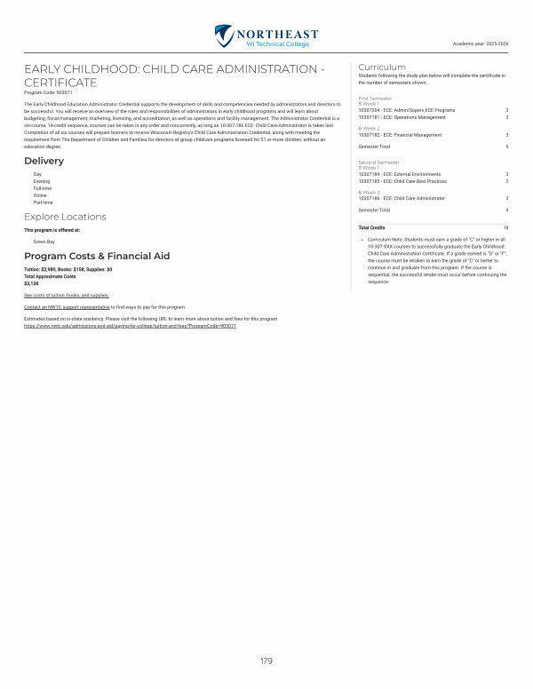 The Early Childhood Education Administrator Credential supports the development of skills and competencies needed by administrators and directors to be successful. You will receive an overview of the roles and responsibilities of administrators in early childhood programs and will learn about budgeting, fiscal management, marketing, licensing, and accreditation, as well as operations and facility management. The Administrator Credential is a six-course, 18-credit sequence, courses can be taken in any order and concurrently, as long as 10-307-186 ECE: Child Care-Administrator is taken last. Completion of all six courses will prepare learners to receive Wisconsin Registry’ s Child Care Administration Credential, along with meeting the requirement from The Department of Children and Families for directors of group childcare programs licensed for 51 or more children, without an education degree.