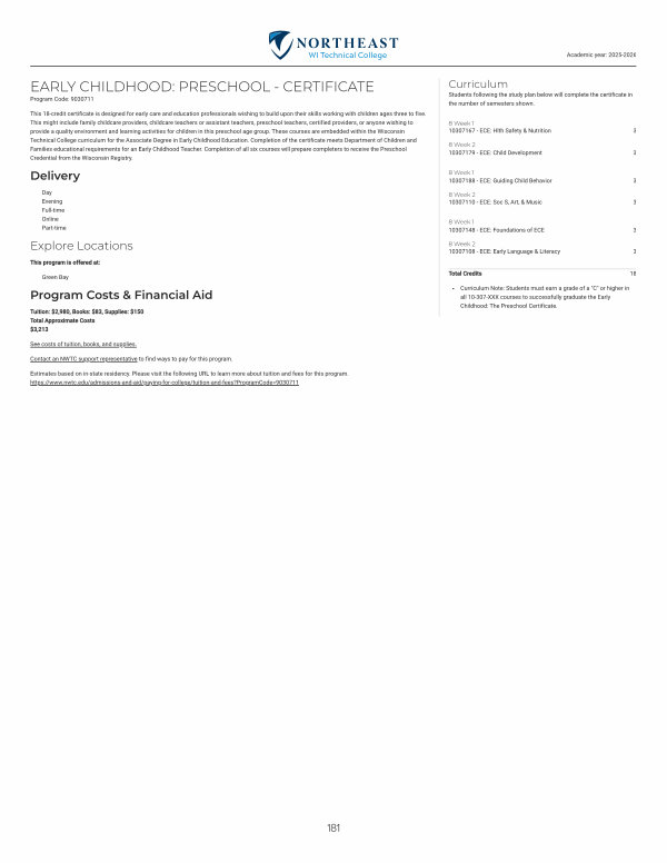 This 18-credit certificate is designed for early care and education professionals wishing to build upon their skills working with children ages three to five. This might include family childcare providers, childcare teachers or assistant teachers, preschool teachers, certified providers, or anyone wishing to provide a quality environment and learning activities for children in this preschool age group. These courses are embedded within the Wisconsin Technical College curriculum for the Associate Degree in Early Childhood Education. Completion of the certificate meets Department of Children and Families educational requirements for an Early Childhood Teacher. Completion of all six courses will prepare completers to receive the Preschool Credential from the Wisconsin Registry.
