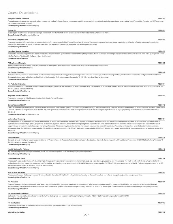 Fire Prevention 10503151 Provides fundamental information regarding the history and philosophy of fire prevention, organization and operation of a fire prevention bureau, use of fire codes, and identification and correction of fire hazards. Meets all requirements for Fire Inspector 1 certification with the State of Wisconsin.( Prerequisites: Fire Fighting Principles( 10-503-142 or 10-503-102 or Firefighter I State Certification and advanced standing in Firefighting Principles) Course Typically Offered: Fall