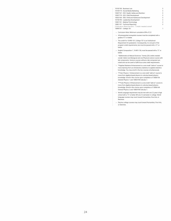 10102150- Business Law 3 10104119- Social Media Marketing 3 10307167- ECE: Health, Safety and Nutrition 3 10307179- ECE: Child Development 3 10522106- EDU: Child and Adolescent Development 3 10196190- Leadership Development 3 10501101- Medical Terminology 3 10801197- Technical Reporting 3 Graduation Requirement- 1 credit needed overall 10890101- College 101 1