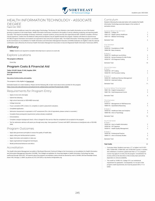 The Health Information Management accreditor of Northeast Wisconsin Technical College is the Commission on Accreditation for Health Informatics and Information Management Education( CAHIIM). The College’ s accreditation for Associate degree in Health Information Technology has been reaffirmed through 2026-2027. All inquiries about the program’ s accreditation status should be directed by mail to CAHIIM, 200 East Randolph Street, Suite 5100, Chicago, IL, 60601; by phone at( 312) 235-3255; or by email at info @ cahiim. org.