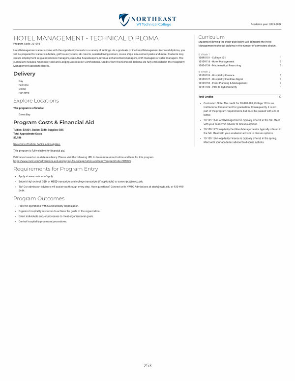 Hotel Management careers come with the opportunity to work in a variety of settings. As a graduate of the Hotel Management technical diploma, you will be prepared for careers in hotels, golf / country clubs, ski resorts, assisted living centers, cruise ships, amusement parks and more. Students may secure employment as guest services managers, executive housekeepers, revenue enhancement managers, shift managers or sales managers. The curriculum includes American Hotel and Lodging Association Certifications. Credits from this technical diploma are fully embedded in the Hospitality Management associate degree.
