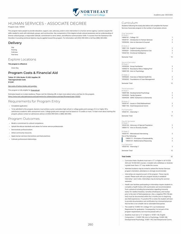 This program trains people to provide education, support, care, advocacy, and / or crisis intervention in a human service agency. Learners acquire the skills needed to work with individuals, groups, and communities. Key components of this degree include cultural awareness and an understanding of diverse cultural groups, a responsible attitude, commitment to serve others, and effective communication skills. 9 courses from the Substance Use Disorders Counseling technical diploma may be applied toward this program. For information call( 920) 498-5444 or toll free( 888) 385-6982.