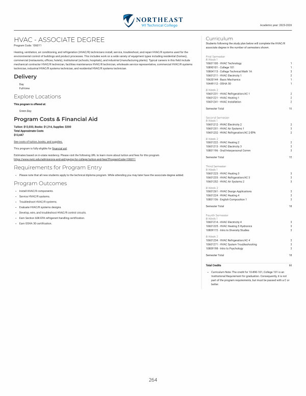 Install HVAC / R components. Service HVAC / R systems. Troubleshoot HVAC / R systems. Evaluate HVAC / R systems designs. Develop, wire, and troubleshoot HVAC / R control circuits. Earn Section 608 EPA refrigerant handling certification. Earn OSHA 30 certification.