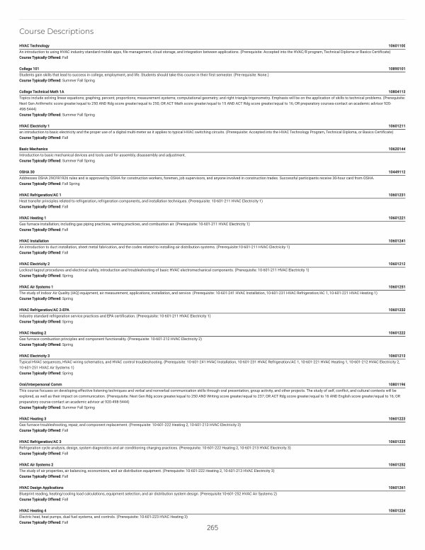HVAC Heating 2 10601222 Gas furnace combustion principles and component functionality.( Prerequisite: 10-601-212 HVAC Electricity 2) Course Typically Offered: Spring