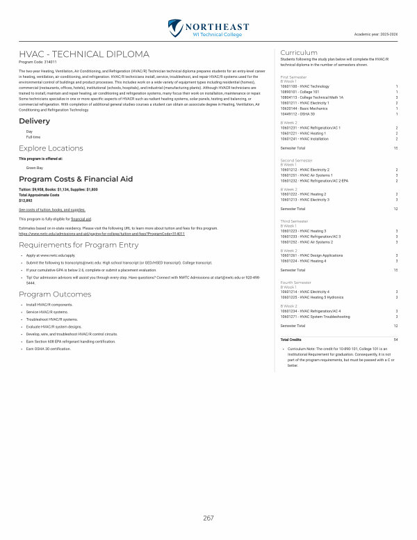 Install HVAC / R components. Service HVAC / R systems. Troubleshoot HVAC / R systems. Evaluate HVAC / R system designs. Develop, wire, and troubleshoot HVAC / R control circuits. Earn Section 608 EPA refrigerant handling certification. Earn OSHA 30 certification.